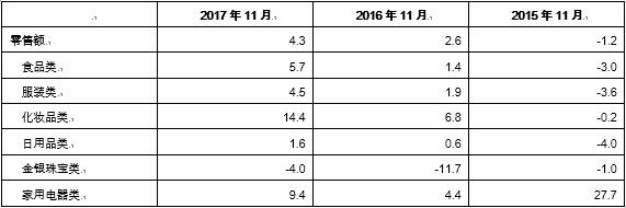 根据乐鱼电竞的监测数据,2017年11月份我国消费品市场表现较好,全国50家重点大型零售企业零售额同比增长4.3%,增速比上年同期提升了1.7个百分点,比上月略微下降0.2个百分点。从1-11月份数据来看,全国50家重点大型零售企业零售额累计同比增长3.5%,高于上年同期4.6个百分点。