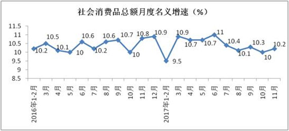 1-11月份,城镇消费品零售额实现284536亿元,同比增长10%,增速比去年同期回落0.3个百分点。其中,11月份城镇消费品零售额同比增长9.9%,增速较2016年同期放缓0.9个百分点,较10月份提高0.1个百分点。