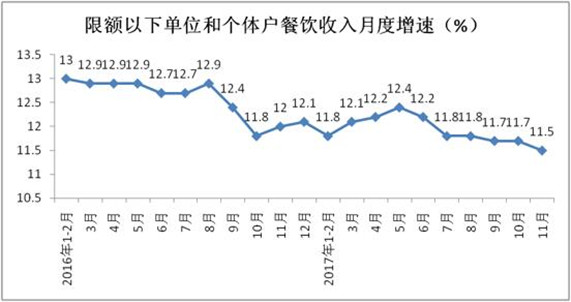 1-11月份,限额以下单位和个体户餐饮收入实现27134亿元,同比增长11.9%,增速比2016年同期回落0.7个百分点。其中,11月份同比增长11.5%,增速较2016年同期放缓0.5个百分点,较10月份放缓0.2个百分点。自6月份开始,限额以下单位和个体户餐饮收入增速呈放缓趋势。