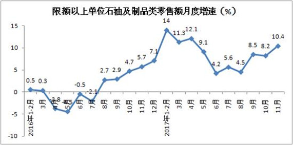 1-11月份,限额以上单位石油及制品类零售额同比增长9.1%,增速比2016年同期加快8.5个百分点,拉动社会消费品零售总额增长0.5个百分点,比去年同期提高0.46个百分点。其中,11月份石油及制品零售额同比增长10.4%,增速较2016年同期加快4.7个百分点,较10月份提高2.2个百分点。下半年,石油及制品类零售额增速呈上升趋势。