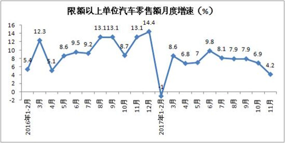 1-11月份,限额以上单位汽车类零售额同比增长6.0%,增速比2016年同期回落3.5个百分点。其中,11月份同比增长4.2%,增速较2016年同期大幅放缓8.9个百分点,较10月份放缓2.7个百分点。自7月份开始,汽车零售额增速在2016年高基数的影响下呈放缓趋势。7-11月份,增速分别较2016年同期放缓1.1、5.2、5.2、1.8和8.9个百分点。
