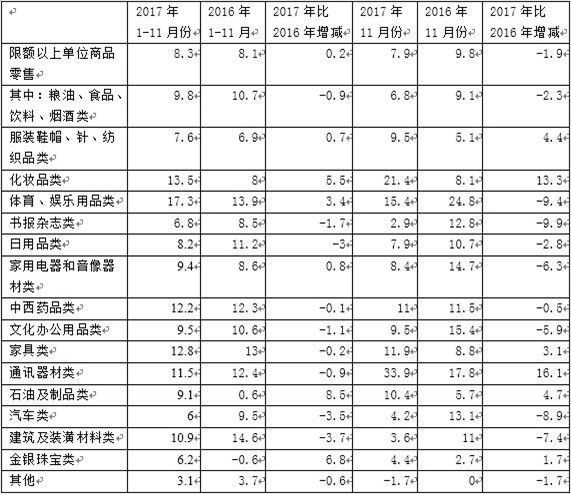 七、1-11月份大众消费增速虽较2016年有所回落,但基本保持稳定增长。