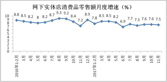 1-11月份,网下实体店零售额同比增长7.8%,比2016年同期回落0.76个百分点。其中11月份网下实体店零售额同比增长7.5%,增速虽较10月份略有放缓0.1个百分点,但快于2016年同期0.3个百分点。
