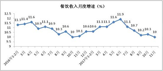 1-11月份,餐饮收入实现35955亿元,同比增长10.8%,增速和2016年同期持平,其中,11月份餐饮收入同比增长10%,增速较2016年同期放缓0.1个百分点,较10月份放缓0.3个百分点。下半年餐饮市场增速整体呈放缓态势,但各月均实现两位数的增速。