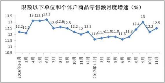 1-11月份,限额以下单位和个体户商品零售额实现158642亿元,同比增长11.9%,增速比2016年同期回落0.5个百分点。其中,11月份同比增长12.5%,增速较2016年同期提高0.5个百分点,较10月份提高0.3个百分点。整体来看,各月增速基本稳定在11%以上。