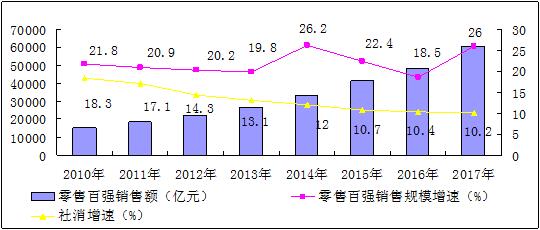 图表1 2010-2017年零售百强销售额及同比增速(%)
