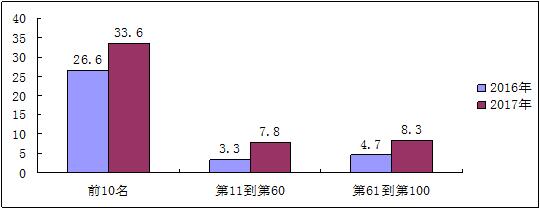 从增速对比来看,2017年前10位企业销售规模同比增长33.6%,比上年同期增长7.0个百分点,比百强整体增速高出7.6个百分点;第11至60位企业销售规模增速为7.8%,比上年同期提高4.5个百分点,低于百强整体增速18.2个百分点。第61至100位企业销售规模增速为8.3%,高于上年同期3.6个百分点,低于百强整体增速17.7个百分点。