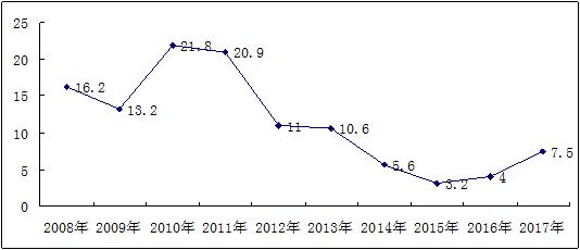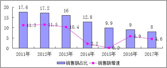 图表8 2006-2017年零售百强销售规模占社会消费品零售总额的比重(%)