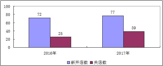 图表18 2016、2017年主要外资零售企业新开店数和关店数(家)