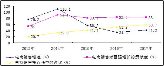 图表 3 2013-2017年电商销售增速、对百强增长的贡献度及占比