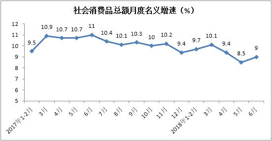 上半年,城镇消费品零售额实现154091亿元,同比增长9.2%,增速比去年同期回落0.9个百分点。其中,6月份城镇消费品零售额同比增长8.8%,增速较2017年同期放缓1.9个百分点。