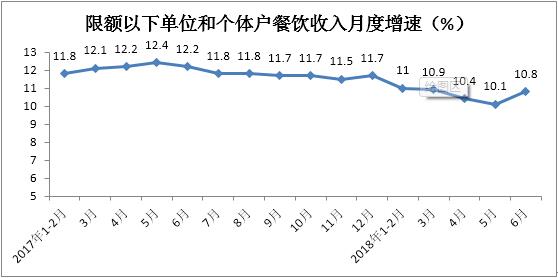上半年,限额以下单位和个体户餐饮收入实现15058亿元,同比增长10.7%,增速比2017年同期回落1.4个百分点。其中,6月份同比增长10.8%,增速较2017年同期放缓1.4个百分点。