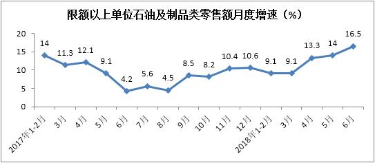 上半年,限额以上单位石油及制品类零售额同比增长11.9%,增速比2017年同期加快1.3个百分点,拉动社会消费品零售总额增长0.61个百分点,比2017年同期提高0.02个百分点。其中,6月份石油及制品零售额同比增长16.5%,增速较2017年同期加快12.3个百分点。