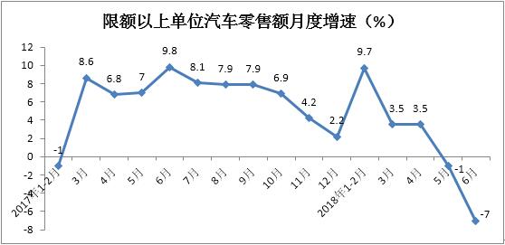 上半年,限额以上单位汽车类零售额同比增长2.7%,增速比2017年同期回落2.5个百分点,拉动社会消费品零售总额增长0.3个百分点,比2017年同期下降0.31个百分点。其中,5、6月份汽车分别同比下降1%和7%,对社会消费品零售总额增长的拉动率比2017年同期分别减少0.96和2.03个百分点。