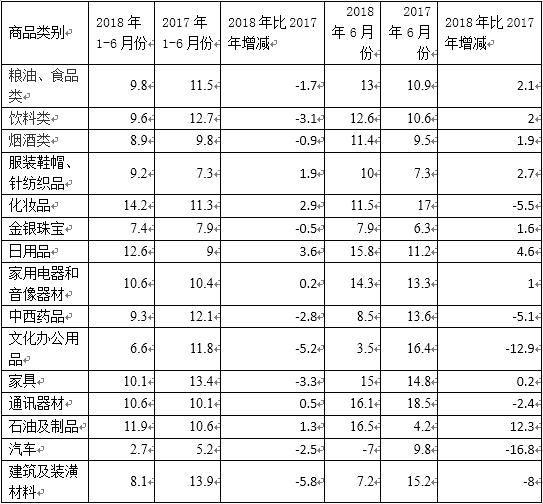 上半年限额以上单位商品中,建筑及装潢材料、文化办公用品、家具类、饮料类分别增长8.1%、6.6%、10.1%和9.6%,增速分别比2017年同期回落5.8、5.2、3.3和3.1个百分点。