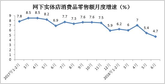 1-6月份,实体店零售额同比增长5.9%,比2017年同期回落2.1个百分点。其中,6月份同比增长4.7%,增速较上年同期放缓2.2个百分点。