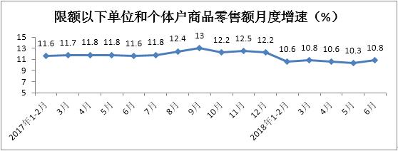 上半年,限额以下单位和个体户商品零售额实现95023亿元,同比增长10.5%,增速比2017年同期回落1.2个百分点。其中,6月份同比增长10.8%,增速较2017年同期放缓0.8个百分点。