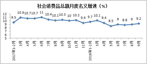 2018年前三季度社会消费品零售总额实现274299亿元,累计增长9.3%,增速与1-8月份持平。其中,9月份社会消费品零售总额实现32005亿元,同比增长9.2%,增速较上月加快0.2个百分点。月度同比增速自8月份连续两个月回升。