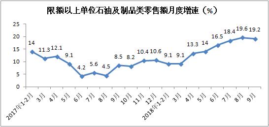 前三季度,限额以上单位石油及制品类零售额同比增长14.4%,增速快于1-8月份0.7个百分点。拉动社会消费品零售总额增长0.72个百分点。其中,9月份同比增长19.2%,增速较上月放缓0.4个百分点。