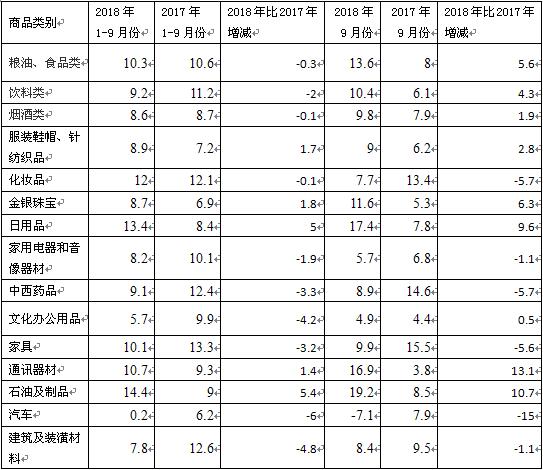 九、前三季度日用品和石油及制品增速涨幅超过5个百分点