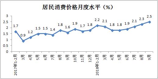 前三季度,居民消费价格累计上涨2.1%,涨幅较2017年同期提高0.6个百分点。其中食品价格同比上涨1.4%,涨幅较2017年同期加快3.1个百分点;非食品价格同比上涨2.2%,涨幅较同期放缓0.1个百分点。消费品价格同比上涨1.8%,涨幅较同期提高1.2个百分点;服务价格同比上涨2.6%,涨幅较上年同期放缓0.3个百分点。