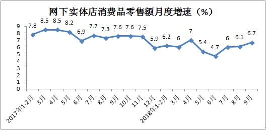 前三季度实体店零售额累计增长6.1%,增速较1-8月份提升0.1个百分点。其中,9月份同比增长6.7%,增速较上月加快0.6个百分点,增速自7月份开始连续快于上月。