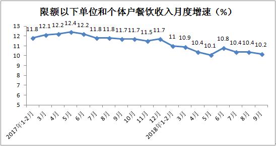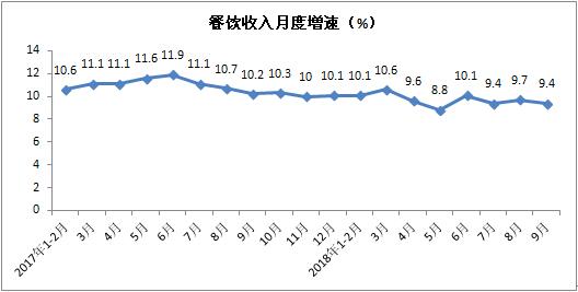 前三季度,餐饮收入实现29763亿元,累计增长9.8%,增速与1-8月份持平。其中,9月份餐饮收入同比增长9.4%,增速较上月放缓0.3个百分点。