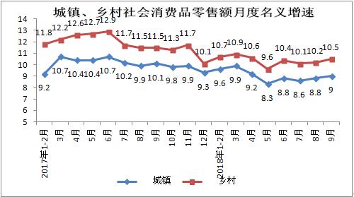 前三季度,乡村消费品零售额实现39582亿元,累计增长10.4%,增速与1-8月份持平。其中,9月份乡村消费品零售额同比增长10.5%,增速较上月提升0.3个百分点。