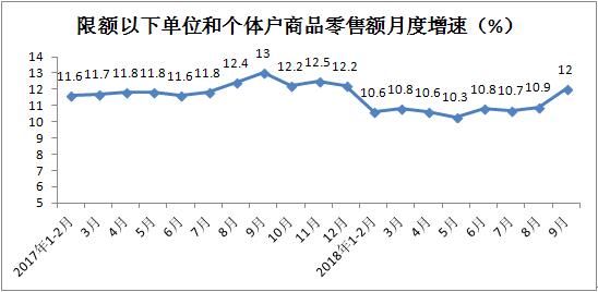 前三季度,限额以下单位和个体户商品零售额实现146437亿元,累计增长10.8%,增速较1-8月份加快0.2个百分点。其中,9月份同比增长12%,增速较上月加快1.1个百分点。前三季度,限额以下单位和个体户商品零售额对商品零售总额增长的贡献率为69.3%,占商品零售总额的比重为59.9%。