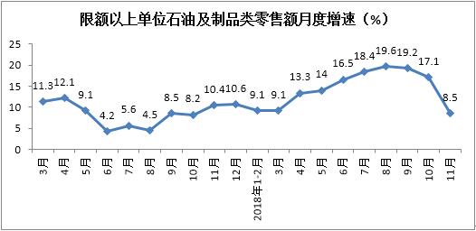 1-11月份,限额以上单位石油及制品类零售额同比增长14%,增速较1-10月份放缓0.6个百分点。拉动社会消费品零售总额增长0.69个百分点。其中,11月份同比增长8.5%,增速较上月大幅放缓8.6个百分点。