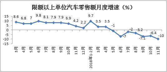 1-11月份,限额以上单位汽车类零售额同比下降1.6%,降幅较1-10月份扩大1个百分点。其中,11月份同比下降10%,自5月份以来,增速连续同比负增长。