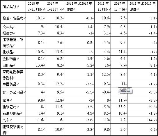 一、1-11月份消费品市场累计增长9.1%,增速近两月持续放缓