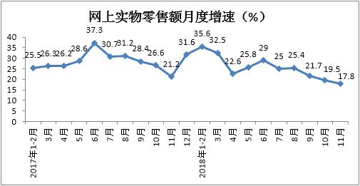二、1-11月份网上实物商品零售额增速累计增长25.4%,月度增速持续三个月放缓
