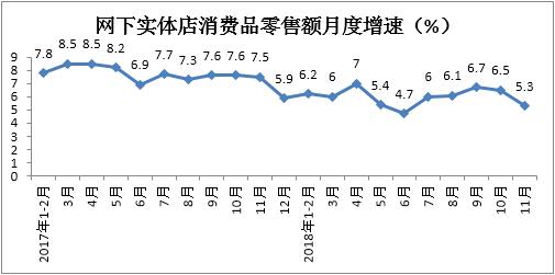 据测算,1-11月份实体店零售额累计增长6%,增速较1-10月份放缓0.1个百分点。其中,11月份同比增长5.3%,增速较上月放缓1.2个百分点。