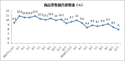 1-11月份,商品零售额实现306799亿元,累计增长9.0%,增速与1-10月份放缓0.1个百分点。其中11月份同比增长8%,增速较上月放缓0.5个百分点。