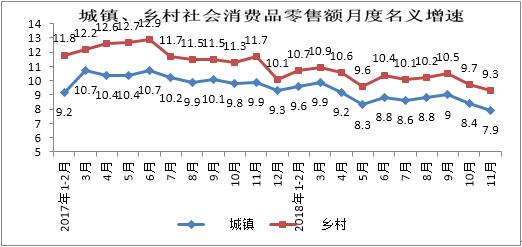 五、1-11月份城乡消费品市场增速较上月均放缓,乡村增速相对较快