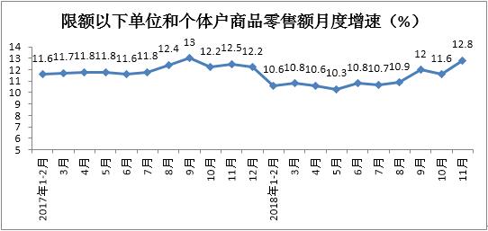 据测算,1-11月份,限额以下单位和个体户商品零售额实现184326亿元,累计增长11%,增速较1-10月份提高0.2个百分点。1-11月份,限额以下单位和个体户商品零售额对商品零售总额增长的贡献率为72.2%,占商品零售总额的比重为60.1%。