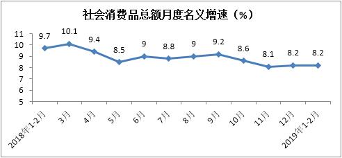 1-2月份我国社会消费品零售总额实现66064亿元,同比增长8.2%,与上年12月份持平。