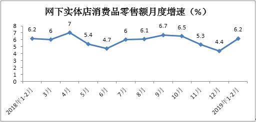 据测算,1-2月份实体店消费品零售额增长6.2%,增速与上年同期持平,较上年12月份加快1.8个百分点。