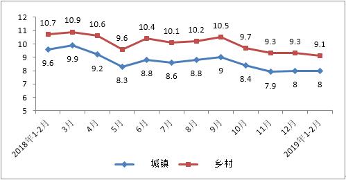 1-2月份城镇消费品零售额实现56210亿元,较上年增长8%,增速与上年12月份持平。乡村消费品零售额实现9854亿元,较上年增长9.1%,增速较上年12月份放缓0.2个百分点。