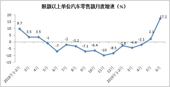 上半年限额以上单位汽车类零售额实现19113亿元,累计增长1.2%,增速较1-5月份提高3.2个百分点。其中,6月份同比增长17.2%,在同期基数较低、汽车消费回暖等综合因素影响下,增速环比大幅回升15.1个百分点。