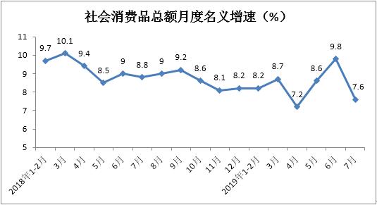 1-7月份我国社会消费品零售总额实现228283亿元,累计增长8.3%,增速较1-6月份放缓0.1个百分点。其中,7月份同比增长7.6%,增速较上月放缓2.2个百分点。