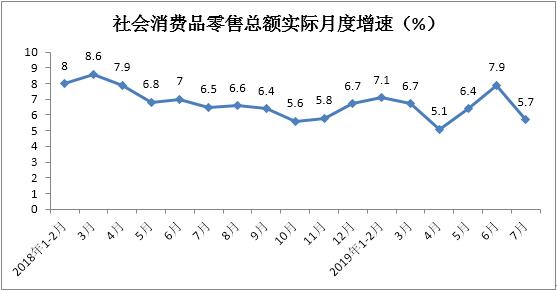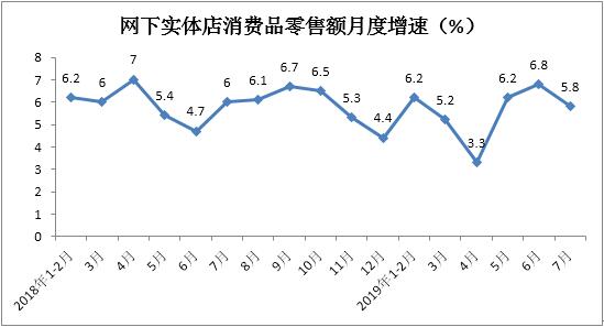 据测算,1-7月份实体店消费品零售额增长5.7%,增速较1-6月份提升0.1个百分点。其中,7月份同比增长5.8%,增速较上月放缓1个百分点。