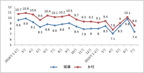 1-7月份城镇消费品零售额实现195277亿元,累计增长8.2%,增速较1-6月份放缓0.1个百分点。乡村消费品零售额实现33005亿元,累计增长9.0%,增速较1-6月份放缓0.1个百分点。其中,7月份城镇消费品市场增长7.4%,增速较上月放缓2.4个百分点,乡村消费品市场增长8.6%,增速较上月放缓1.5个百分点。