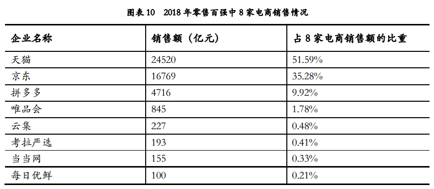 2018年入围零售百强的电商企业变换较大,拼多多、云集、每日优鲜等电商新业态迎合了新的潜在消费需求快速发展,为2018年新进入百强的企业。