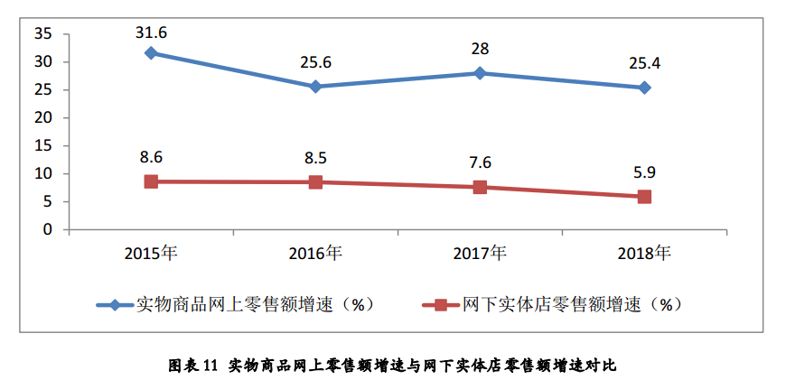 根据国家统计局数据测算,2018年我国网下实体店零售额增速同比增长5.9%,相比上年放缓1.7个百分点,网下实体店零售额增速虽然明显低于网上实物商品消费增速,但是2018年网下实体零售店努力开拓新业态、提升供应链效率、增强消费体验,整体保持了较为平稳的增长。