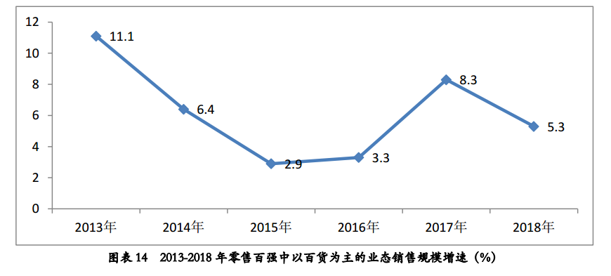 根据乐鱼电竞数据,2018年,零售百强中以百货为主的业态销售规模同比增长5.3%,增速低于去年同期3.0个百分点。