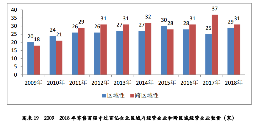 随着近年消费品市场增速的平稳放缓,市场竞争的加剧以及零售市场渠道的分化,零售企业在市场布局上进一步巩固和稳定区域性市场,跨区域性市场扩张放慢。2018年零售百强过百亿的67家零售企业中,扣除其中7家网上零售企业,其余60家实体零售企业,有31家跨区域经营企业,29家区域内经营企业,与2017年相比,跨区域经营企业减少6家,区域内经营企业增加4家。31家跨区域企业零售规模增速同比下降16.2%,而区域性企业零售规模增速同比增长16.0%。
