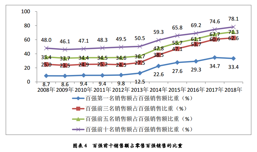 2018年,我国零售百强企业中,第1名企业销售规模为24520亿元,占百强整体销售规模的比重为33.4%,比2017年下降1.3个百分点;前3名企业销售规模合计为46005亿元,占百强规模的比重为62.6%,比2017年上升2个百分点;前5名企业销售规模合计为52375.9亿元,占百强规模的比重为71.3%,比2017年上升3.5个百分点;前10名企业的销售规模合计为57378.8亿元,占百强整体销售规模的比重为78.1%,比2017年上升3.5个百分点。