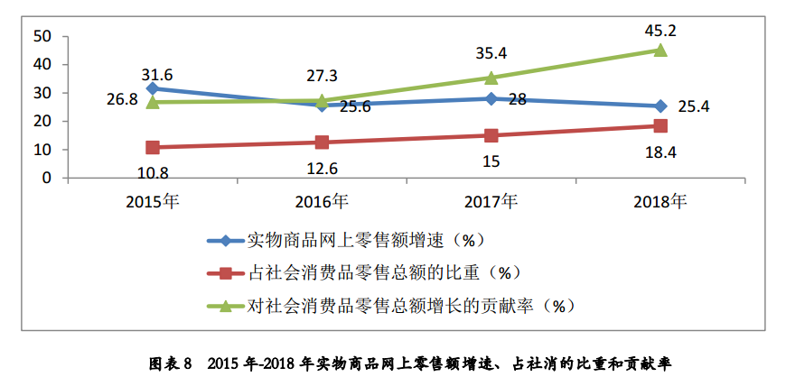 根据国家统计局数据,2018年,社会消费品零售总额中网上实物商品零售额由于基数的扩大,增速有所回落,但增长速度仍明显快于实体店增速和社会消费品零售总额增速,对社会消费品零售总额增长的贡献率也继续提高。2018年,全国实物商品网上零售额同比增长25.4%,增速快于社会消费品零售总额增速16.4个百分点;占社会消费品零售总额比重为18.4%,比上年提高3.4个百分点;对社会消费品零售总额增长的贡献率为45.2%,比上年提高9.8个百分点;拉动社会消费品零售总额增长4.1个百分点,比上年提高0.5个百分点。